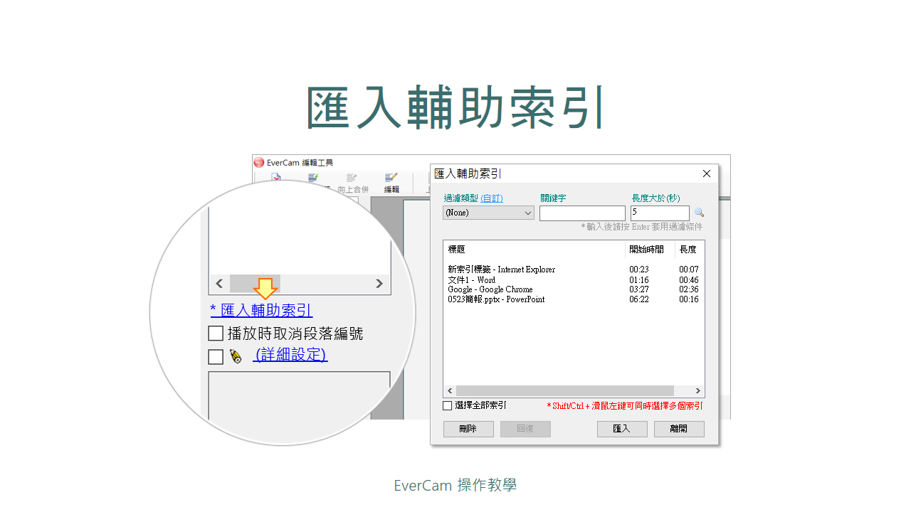 匯入輔助索引很簡單! 首先,進入「EverCam / 編輯講解」,再參考下列步驟,就能匯入輔助索引。
