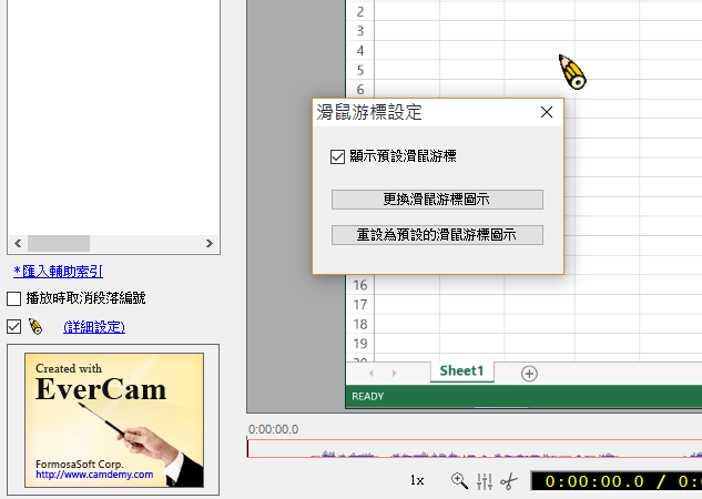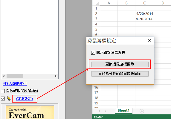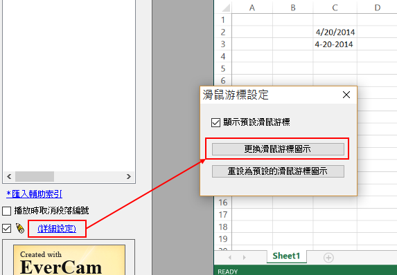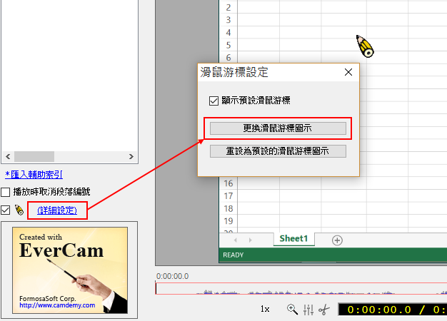 請進入「EverCam > 編輯講解」,並點選「詳細設定」即可進行滑鼠游標更換,如下圖。