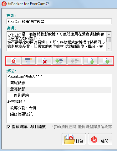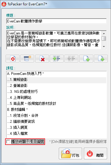 透過 fsPacker 可以將多份教材打包成一份完整的 flash 課程,並能直接燒錄進光碟中,方便備份與分享。