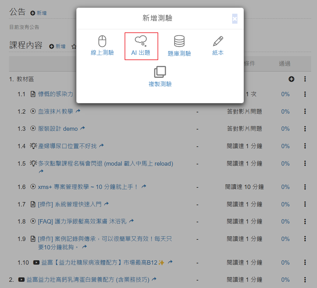 從課程內容中,新增測驗時,選「AI 出題」