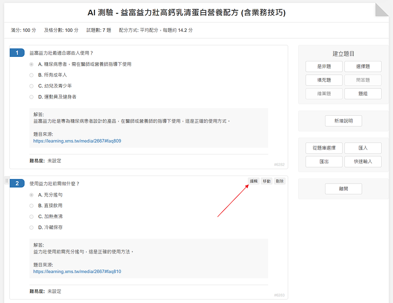 完成後,就會進入測驗的編輯畫面,方便我們確認是否正確。