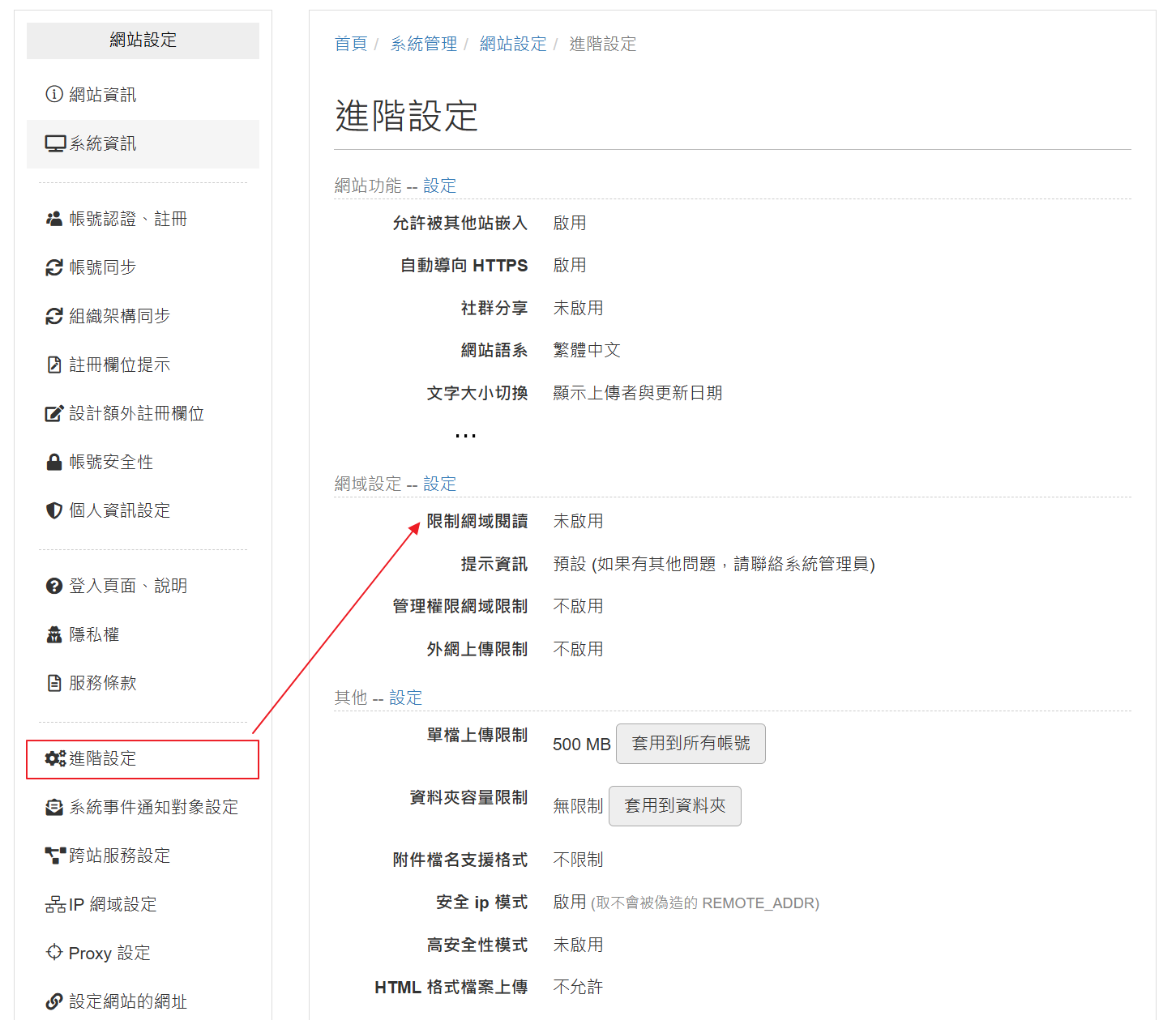 在「系統管理 / 網站設定 / 進階設定」的區塊「