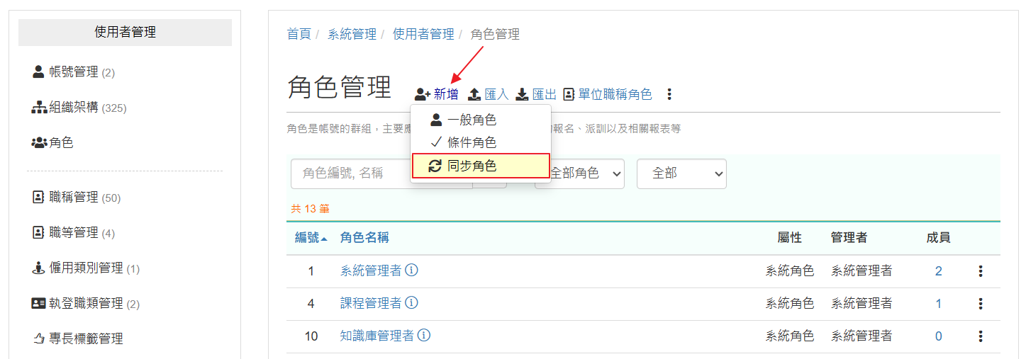 點擊「新增」下拉選單中的「同步角色」並設定角色的名稱 (行政人員)。