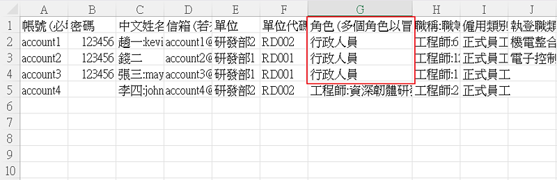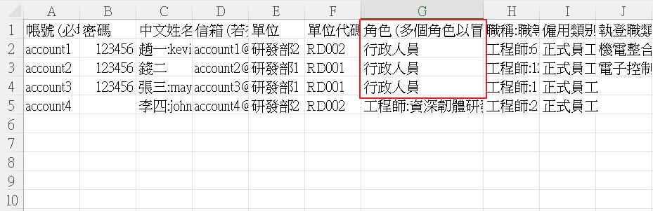 將帳號 A 的「角色」欄位,填上「行政人員」。