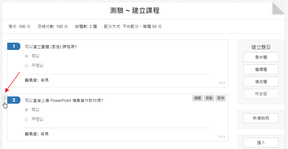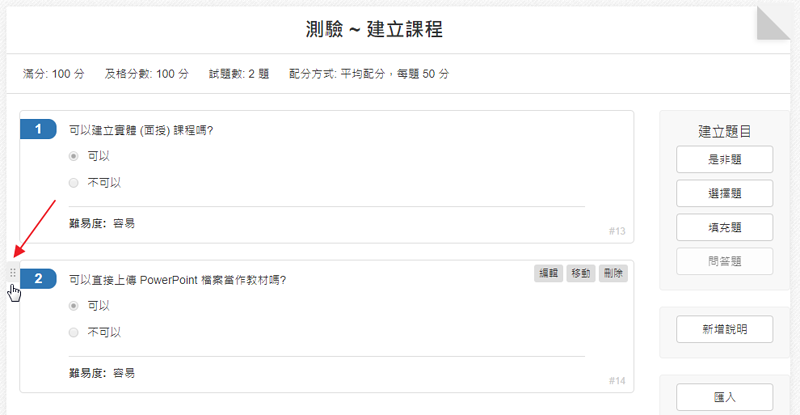 除了可以拖曳排序之外,當題目數量較多時,可以直透過「移動」設定順序。