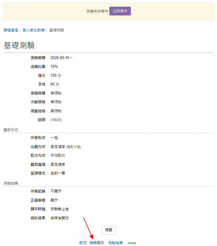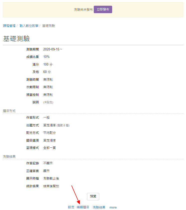 包括題目形式 (隨機出題、平均配分等)、測驗結果顯示時機 ...,通常使用系統預設值就可以了。