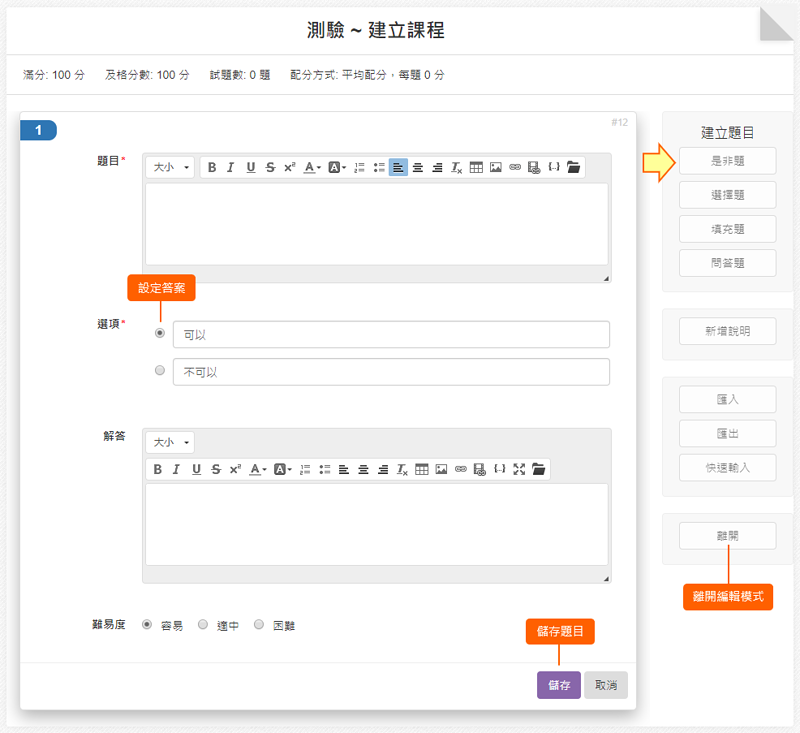 依序建立是非、選擇、填充及問答題各一題,編輯完成後點擊「離開」。