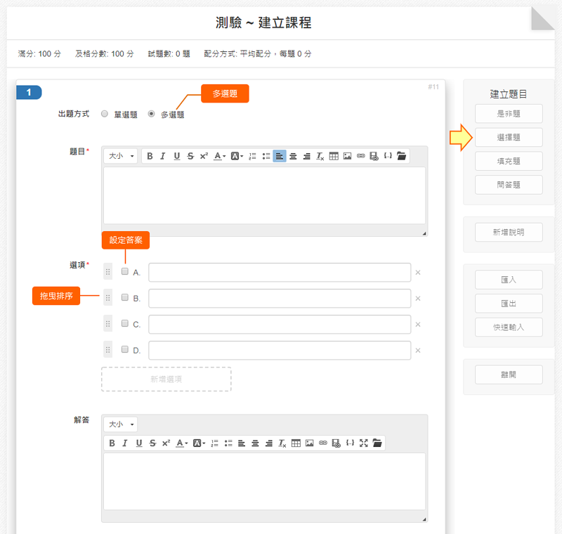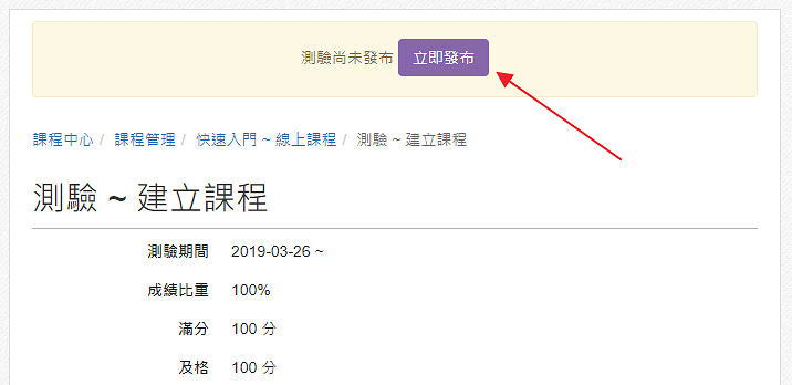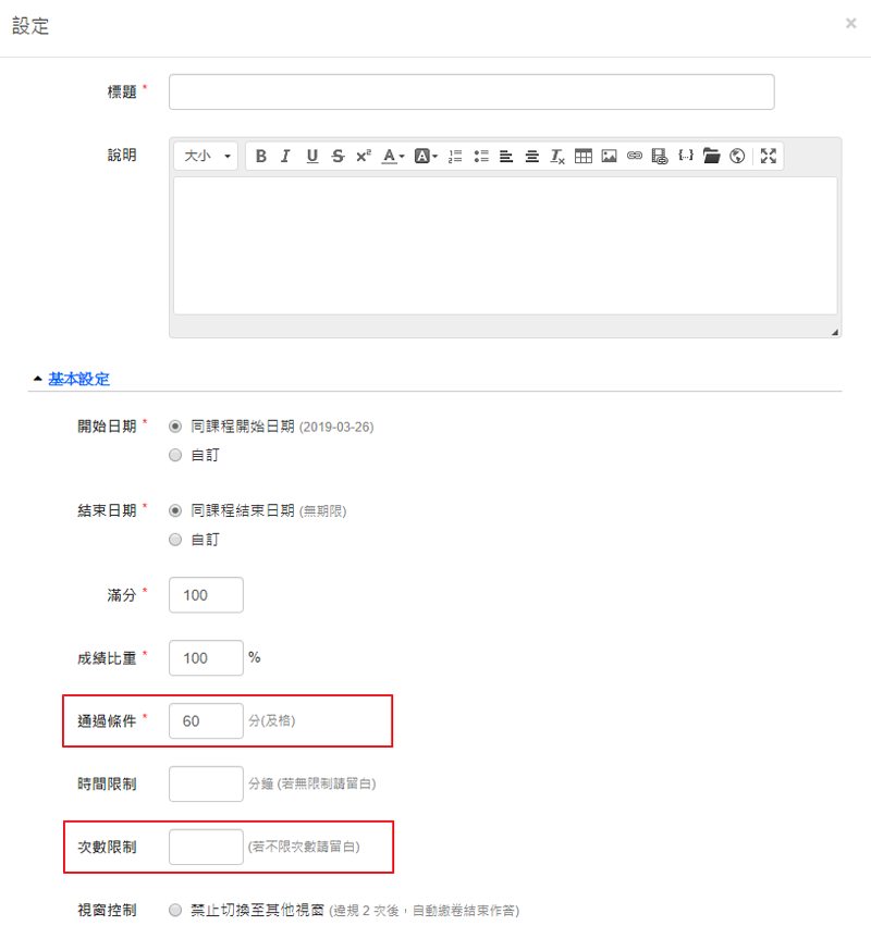 如果要達到更好的學習成效,建議通過條件為 100 分,次數限制 2 次,強迫學員每一題都仔細確認並作答。