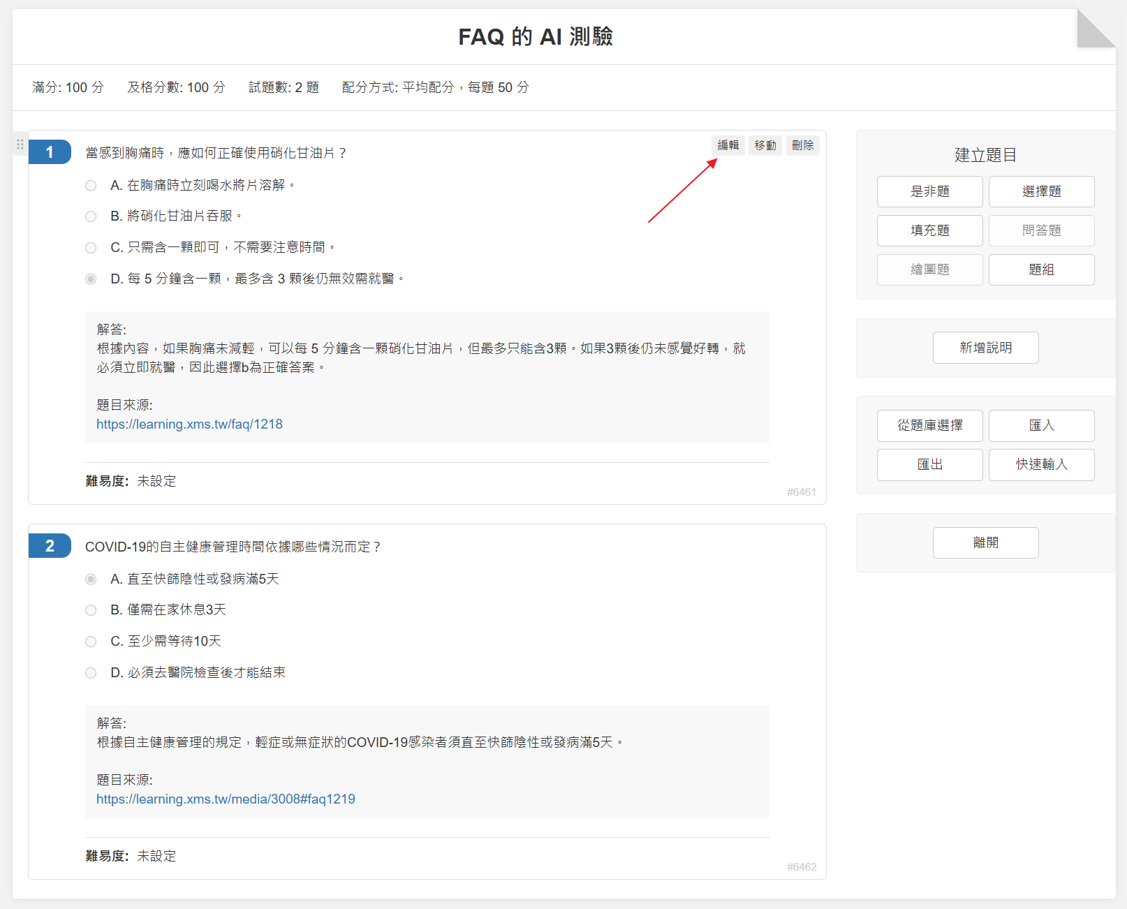 會直接進入測驗編輯頁面,方便檢視與修改 AI 設計的題目。