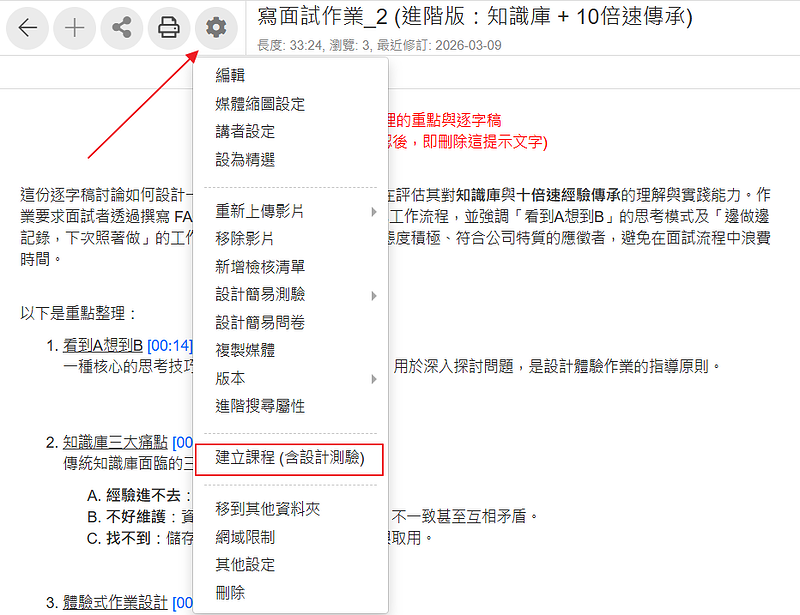 就一個小小的 click 動作,AI 就會建立課程,將錄影檔變成教材,還會將上課內容的重點設計成測驗題目,並且設定成「100 分及格、只能考 3 次」。